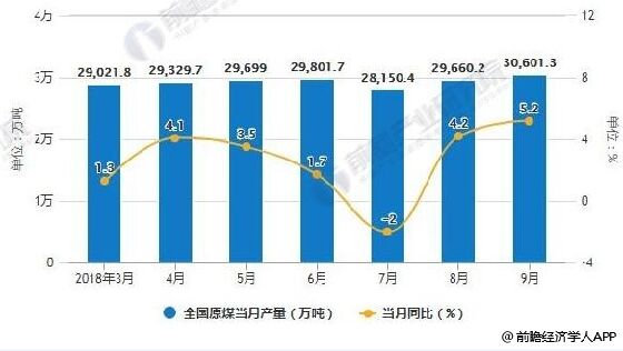 煤炭行業(yè)發(fā)展概況分析 煤炭是我國主體能源和基礎產(chǎn)業(yè),長期以來受到黨和政府的高度重視。在相當長一段時間內(nèi),甚至從長遠來講,我國還是以煤為主的能源格局,只不過比例會下降,我們對煤的注意力不要分散。我們正在壓縮煤炭比例,但國情還是以煤為主,我國煤炭資源豐富,在發(fā)展新能源、可再生能源的同時,還要做好煤炭這篇大文章。既然要做好煤炭這篇大文章,就要研究做什么樣的煤炭大文章,怎樣做好煤炭大文章這個重大時代命題。 9月原煤產(chǎn)量統(tǒng)計分析 據(jù)前瞻產(chǎn)業(yè)研究院發(fā)布的《煤炭行業(yè)發(fā)展趨勢與投資決策分析報告》統(tǒng)計數(shù)據(jù)顯示,2018年3-6月全國原煤產(chǎn)量呈小幅度增長趨勢,2018年6月全國原煤產(chǎn)量為29801.7萬噸,同比增長1.7%。2018年7月全國原煤產(chǎn)量下降,2018年8-9月全國原煤產(chǎn)量回升;2018年9月全國原煤產(chǎn)量為30601.3萬噸,同比增長5.2%。2018年1-9月全國原煤產(chǎn)量為258447萬噸,同比增長5.1%。