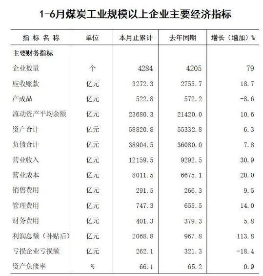 日前,2021年上半年全國(guó)規(guī)模以上煤炭企業(yè)主要經(jīng)濟(jì)指標(biāo)公布。 上半年,煤炭行業(yè)經(jīng)濟(jì)形勢(shì)總體穩(wěn)中向好,行業(yè)營(yíng)收及利潤(rùn)均實(shí)現(xiàn)較高增長(zhǎng),虧損企業(yè)虧損額下降;行業(yè)營(yíng)收增幅首次超過(guò)全國(guó)工業(yè)行業(yè)平均水平,企業(yè)資產(chǎn)負(fù)債率略有提高,應(yīng)收賬款增加。 指標(biāo)顯示,上半年4284家規(guī)模以上煤炭企業(yè)營(yíng)業(yè)收入12159.5億元,同比增長(zhǎng)30.9%,增幅比規(guī)模以上工業(yè)行業(yè)平均高3個(gè)百分點(diǎn);營(yíng)業(yè)成本8011.5億元,同比增長(zhǎng)20.0%;應(yīng)收賬款3272.3億元,同比增長(zhǎng)18.7%;利潤(rùn)總額(補(bǔ)貼后)2068.8億元,同比增長(zhǎng)113.8%。 上半年,規(guī)模以上煤炭企業(yè)資產(chǎn)合計(jì)58820.8億元,同比增長(zhǎng)6.3%;負(fù)債合計(jì)38904.5億元,同比增長(zhǎng)7.8%;資產(chǎn)負(fù)債率66.1%,比去年同期增加0.9個(gè)百分點(diǎn)。 指標(biāo)顯示,上半年,規(guī)模以上煤炭企業(yè)流動(dòng)資產(chǎn)平均余額23680.3億元,同比增長(zhǎng)10.6%;企業(yè)銷(xiāo)售費(fèi)用、管理費(fèi)用和財(cái)務(wù)費(fèi)用,分別較上年增長(zhǎng)9.5%、14.0%和5.8%。(數(shù)據(jù)來(lái)源國(guó)家統(tǒng)計(jì)局)