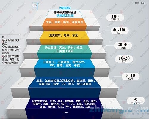 二、工程項(xiàng)目市場(chǎng)增長(zhǎng)好于預(yù)期,超大項(xiàng)目、中小項(xiàng)目、樓盤配套齊頭并進(jìn)。與家裝零售市場(chǎng)的不景氣相比,工程項(xiàng)目市場(chǎng)在2018年度的表現(xiàn)卻要好于各企業(yè)的預(yù)期?梢哉f,正是由于工程項(xiàng)目市場(chǎng)好于預(yù)期的增長(zhǎng),才使得2018年度全國(guó)市場(chǎng)能夠繼續(xù)保持增長(zhǎng)態(tài)勢(shì)。否則,一旦工程項(xiàng)目市場(chǎng)不景氣,整體市場(chǎng)有可能面臨下滑的風(fēng)險(xiǎn)。在工程項(xiàng)目市場(chǎng)中,超大項(xiàng)目、中小項(xiàng)目和樓盤配套這三個(gè)細(xì)分市場(chǎng)的表現(xiàn)較為搶眼。機(jī)場(chǎng)、酒店、地鐵、會(huì)展中心等一批超大項(xiàng)目給予了各企業(yè)市場(chǎng)份額增長(zhǎng)的空間,而中小項(xiàng)目的增長(zhǎng)則為企業(yè)的增長(zhǎng)奠定了基礎(chǔ),在家裝零售市場(chǎng)遭遇挑戰(zhàn)的情況下,樓盤配套市場(chǎng)幫助多聯(lián)機(jī)企業(yè)實(shí)現(xiàn)了在2018年度的增長(zhǎng)。 三、產(chǎn)品市場(chǎng)表現(xiàn)各異,磁懸浮離心機(jī)、風(fēng)冷螺桿機(jī)組、模塊機(jī)組三大產(chǎn)品異軍突起。在2018年度整體市場(chǎng)實(shí)現(xiàn)個(gè)位數(shù)的增長(zhǎng)過程中,產(chǎn)品市場(chǎng)的表現(xiàn)也各不相同。其中,離心機(jī)組市場(chǎng)雖然增長(zhǎng)不多,但磁懸浮離心機(jī)卻得到了進(jìn)一步的發(fā)展。在2018年4月舉行的中國(guó)制冷展上,主流參展企業(yè)幾乎都帶來了磁懸浮離心機(jī)產(chǎn)品,同年10月,天加并購(gòu)全球最大的磁懸浮(OFC)中央空調(diào)企業(yè)“SMARDT”,使這一市場(chǎng)更添熱度。由于數(shù)據(jù)中心等細(xì)分市場(chǎng)的火熱,使得風(fēng)冷螺桿機(jī)組成為2018年度冷水機(jī)組市場(chǎng)中增長(zhǎng)最快的產(chǎn)品之一,部分企業(yè)風(fēng)冷螺桿機(jī)組的出貨金額甚至大于水冷螺桿機(jī)組。模塊機(jī)組則由于應(yīng)用廣泛以及“商用煤改電”的助力,在2018年度取得了快速的增長(zhǎng)。與之相對(duì)的是,水冷螺桿機(jī)組、水地源熱泵機(jī)組等產(chǎn)品由于各種原因遭遇了整體市場(chǎng)的下滑。 四、數(shù)據(jù)中心、醫(yī)藥、軌道交通等細(xì)分行業(yè)繼續(xù)保持增長(zhǎng)。2018年度,最為火熱的細(xì)分市場(chǎng)恐怕要數(shù)數(shù)據(jù)中心市場(chǎng)了,數(shù)據(jù)中心公司為部分企業(yè)集中處理數(shù)據(jù)業(yè)務(wù),成為2018年數(shù)據(jù)中心市場(chǎng)新的增長(zhǎng)點(diǎn),這也直接導(dǎo)致了風(fēng)冷螺桿機(jī)組的市場(chǎng)增長(zhǎng)。醫(yī)藥行業(yè)作為近幾年發(fā)展良好的市場(chǎng)在2018年持續(xù)火熱,越來越多的中央空調(diào)企業(yè)參加“藥機(jī)展”就是這一市場(chǎng)火熱的證明。軌道交通作為一項(xiàng)持續(xù)推進(jìn)的工程,在每年均有不少的項(xiàng)目數(shù)量,而在這一市場(chǎng)中更傾向于采用國(guó)產(chǎn)品牌的產(chǎn)品。此外,工業(yè)市場(chǎng)也是2018年表現(xiàn)較為搶眼的細(xì)分市場(chǎng),一些專注于工業(yè)市場(chǎng)的中央空調(diào)企業(yè)在2018年度同樣取得了顯著的進(jìn)步。 五、部分企業(yè)開始實(shí)行多品牌運(yùn)作模式。2018年度,有多個(gè)企業(yè)開始實(shí)行雙品牌乃至三品牌的運(yùn)作模式。其中包括,海信日立公司運(yùn)作的日立、海信、約克VRF三個(gè)品牌,海爾中央空調(diào)運(yùn)作的海爾、卡薩帝雙品牌,美的中央空調(diào)運(yùn)作的美的、Clivet雙品牌等等,以及天加環(huán)境后續(xù)即將迎來的天加、SMARDT雙品牌。這是中央空調(diào)企業(yè)新的嘗試,在細(xì)分產(chǎn)品的同時(shí),這些企業(yè)希望通過細(xì)分品牌,為用戶打造差異化的產(chǎn)品和服務(wù),從而尋求更高的市場(chǎng)空間,同時(shí)也給予渠道經(jīng)銷商更多的選擇。 基于以上的市場(chǎng)特點(diǎn),中央空調(diào)企業(yè)在2018年的表現(xiàn)也不盡相同。根據(jù)慣例,我們根據(jù)各個(gè)企業(yè)2018年度在中國(guó)市場(chǎng)的出貨額,對(duì)其進(jìn)行大致的陣營(yíng)劃分。當(dāng)然,由于每年企業(yè)出貨額的不同,陣營(yíng)的劃分標(biāo)準(zhǔn)也會(huì)有所變化。因此,在2018年度,大金、海信日立、美的、格力四個(gè)企業(yè)的出貨額均超過100億元而被列入第一陣營(yíng);第二陣營(yíng)為40-100億元的企業(yè),2018年達(dá)到這一標(biāo)準(zhǔn)的企業(yè)為海爾、東芝、麥克維爾;第三陣營(yíng)為20-40億元的企業(yè),2018年共計(jì)有天加、約克品牌、開利、特靈、三菱重工海爾等5個(gè)企業(yè);第四陣營(yíng)為10-20億元的企業(yè),共有三菱重工、三菱電機(jī)、頓漢布什、EK、荏原、志高、申菱等7個(gè)企業(yè);第五陣營(yíng)為5-10億元的企業(yè),共有三星、江森自控日立萬寶空調(diào)、奧克斯、國(guó)祥、克萊門特、遠(yuǎn)大、LG、松下、富士通將軍等9個(gè)企業(yè);第六陣營(yíng)為5億元以下的企業(yè),在此就不一一列舉,我們僅列出部分品牌以供參考。(見圖3)