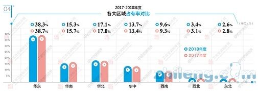 時(shí)至2018年度,艾肯空調(diào)制冷網(wǎng)通過連續(xù)幾年的監(jiān)測(cè),基本可以確定的是,主流品牌的市場(chǎng)集中度一直在加強(qiáng),且品牌格局有固化的趨勢(shì)。比如處于第一陣營(yíng)中的100億元以上的企業(yè)大金、海信日立、美的、格力,目前為止尚看不出有其他哪個(gè)品牌可以超越。這四個(gè)品牌在2018年度的表現(xiàn)基本是家裝零售市場(chǎng)面臨挑戰(zhàn),但工程項(xiàng)目市場(chǎng)尤其是房地產(chǎn)樓盤配套獲得了相對(duì)不錯(cuò)的增長(zhǎng)。其中,海信日立公司海信品牌的增長(zhǎng)最為突出。 在第二陣營(yíng)品牌中,海爾中央空調(diào)在磁懸浮離心機(jī)、更新機(jī)以及多聯(lián)機(jī)等產(chǎn)品市場(chǎng)增長(zhǎng)明顯,且卡薩帝品牌也為其提供了更多的助力,因此海爾中央空調(diào)的出貨額在2018年度再創(chuàng)新高,其增長(zhǎng)率也遠(yuǎn)高于行業(yè)平均增幅。東芝憑借在精裝修樓盤配套市場(chǎng)的優(yōu)異成績(jī),在2018年度獲得了較好的增長(zhǎng),其銷售規(guī)模也達(dá)到了50億元級(jí)別,且市場(chǎng)占有率進(jìn)一步提升,繼續(xù)鞏固其在日系多聯(lián)機(jī)品牌前三甲的位置。麥克維爾則繼續(xù)穩(wěn)扎穩(wěn)打,在2018年度實(shí)現(xiàn)了穩(wěn)定的增長(zhǎng)。在江森自控約克品牌將多聯(lián)機(jī)業(yè)務(wù)交由海信日立公司銷售之后,事實(shí)上,在2018年度麥克維爾已經(jīng)在市場(chǎng)總量上實(shí)現(xiàn)了對(duì)約克品牌的超越。 其它美系品牌中,約克品牌盡管不再銷售多聯(lián)機(jī)產(chǎn)品,但其渠道業(yè)務(wù)和兩聯(lián)供產(chǎn)品仍然獲得了不錯(cuò)的增長(zhǎng);特靈則以更加靈活的政策在2018年度取得了美系品牌中最高的增長(zhǎng)率,其離心機(jī)產(chǎn)品和兩聯(lián)供產(chǎn)品表現(xiàn)搶眼;開利則繼續(xù)加強(qiáng)了對(duì)離心機(jī)以及輕商產(chǎn)品的銷售;頓漢布什則在細(xì)分市場(chǎng)如軌道交通等行業(yè)繼續(xù)保持領(lǐng)先優(yōu)勢(shì)。 值得一提的是天加,在整體市場(chǎng)不利的情況下,天加實(shí)現(xiàn)了超過20%的增長(zhǎng),其銷售規(guī)模也順利超過開利。2018年度,天加繼續(xù)在末端及凈化領(lǐng)域保持領(lǐng)先優(yōu)勢(shì),與此同時(shí),多聯(lián)機(jī)業(yè)務(wù)成為天加新的增長(zhǎng)點(diǎn)。 其它主營(yíng)多聯(lián)機(jī)產(chǎn)品的品牌中,三菱重工海爾、三菱重工、三星、松下等日韓系品牌,和志高、奧克斯等國(guó)產(chǎn)品牌都取得了一定的增長(zhǎng)。冷水機(jī)組品牌中,荏原在溴化鋰和離心機(jī)兩個(gè)產(chǎn)品領(lǐng)域都取得了不錯(cuò)的業(yè)績(jī),EK、江森自控日立萬寶空調(diào)、申菱、國(guó)祥、克萊門特等品牌也在各自擅長(zhǎng)的領(lǐng)域中有較好的表現(xiàn)。 在區(qū)域?qū)用,通過對(duì)比2017-2018年度各大區(qū)域的占有率可以看出,受家裝零售市場(chǎng)影響,華東區(qū)域的占有率略有下滑,受整體大環(huán)境影響占有率同比下滑的區(qū)域還有華南區(qū)域和東北區(qū)域,華北區(qū)域變化不大,而華中、西南、西北所代表的中西部地區(qū)由于仍有增長(zhǎng)潛力和產(chǎn)業(yè)轉(zhuǎn)移等因素,在2018年度的占有率繼續(xù)保持提升,與其它下滑的區(qū)域形成鮮明的對(duì)比。(見圖4)