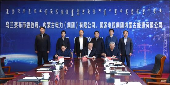 國(guó)家電投內(nèi)蒙古公司(右)與烏蘭察布市(中)、內(nèi)蒙古電力(集團(tuán))有限責(zé)任公司(左)三方代表簽署合作協(xié)議