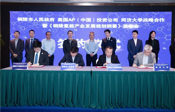 氫能長江,銅都起航。4月28日上午,銅陵市政府、美國AP(中國)投資公司、同濟大學戰(zhàn)略合作暨《銅陵氫能產(chǎn)業(yè)發(fā)展規(guī)劃綱要》發(fā)布會舉行,發(fā)布全省首個氫能產(chǎn)業(yè)發(fā)展規(guī)劃,安徽銅陵將建立全省首個落地的氫能產(chǎn)業(yè)世界五百強企業(yè)、全省首個氫能產(chǎn)業(yè)研究院。銅陵市委副書記、市長胡啟生致辭并揭牌,銅陵市領導程雙林、黃學龍;美國AP(中國)投資公司副總裁、氫能公司總經(jīng)理郁峰,同濟大學燃料電池復合電源研究所所長張存滿等出席。副市長黃學龍主持。