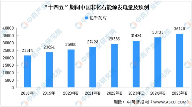 根據(jù)預(yù)測,非化石能源在一次能源消費(fèi)中的占比有望在2025年達(dá)到20%!笆奈濉逼陂g,我國非化石能源消費(fèi)總量將進(jìn)一步提高,預(yù)計2021年約為52億噸標(biāo)準(zhǔn)煤,到2025年約為58億噸標(biāo)準(zhǔn)煤。非化石能源發(fā)電量同樣保持增長。據(jù)預(yù)測,2021年我國非化石能源發(fā)電量約為27428億千瓦時,到2025年將超過36100億千瓦時。
