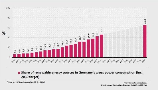 據(jù)德國能源工業(yè)協(xié)會BDEW和太陽能與氫研究中心Baden Wuerttemberg(ZSW)公布的初步數(shù)據(jù)顯示,2020年可再生能源發(fā)電將占德國電力消費的46%以上,與前一年相比增加了4個百分點。 然而,可再生能源比例增長的部分原因是新冠疫情引起的電力消耗降低。總體而言,可再生能源發(fā)電量比前一年增加。這主要是由于有利的天氣條件,特別是在2020年前三個月,陸上風(fēng)力發(fā)電量增加了4%,海上風(fēng)力發(fā)電量增加了11%。今年的陽光充裕進一步促進了太陽能發(fā)電量的顯著增長,比前一年增加了12%。