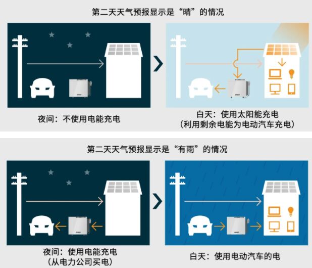 V2H-充放電器作為能源管理可單獨使用,但通過與HEMS結(jié)合,便可以使用更多功能,比如天氣預(yù)報功能,晴天時,光伏發(fā)電既能滿足家庭內(nèi)部的電力,同時給電動汽車充電。如果是陰雨天,則可在電價低的夜間進行充電以應(yīng)對白天的用電需求。