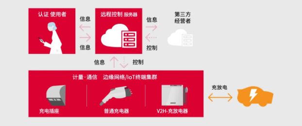 隨著可再生能源逐漸成為社會共識,VPP(虛擬發(fā)電廠)系統(tǒng)逐步發(fā)揮更大作用。電動汽車的充放電服務(wù)對VPP(虛擬發(fā)電廠)而言也是不可或缺的重要組成。集中管理的充放電服務(wù)主要分為兩個要素,一個是邊緣側(cè),正在開發(fā)與電裝的V2H-充放電器等連接的IoT物聯(lián)網(wǎng)終端,該終端將具備電力計算和遠(yuǎn)程控制的功能。另一個是服務(wù)器端,將來自多個終端的信息進行匯總和分析,并為每個充放電器發(fā)出恰當(dāng)?shù)某潆姾头烹娭噶睢?nbsp;