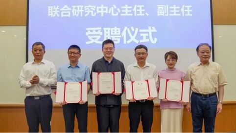 中國(guó)科學(xué)院院士馬余剛(左一)、褚君浩(右一)為聯(lián)合研究中心負(fù)責(zé)人頒發(fā)聘書