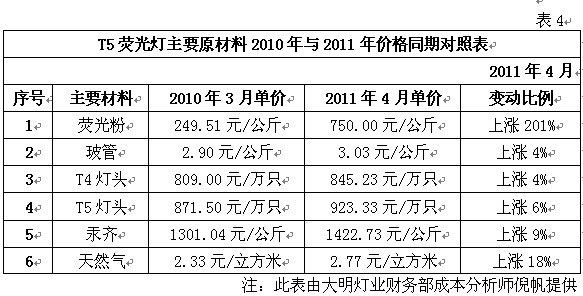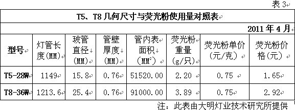 注:此表來源公共機構(gòu)節(jié)能“十二五”規(guī)劃征求意見稿 我們知道,規(guī)劃中所說的高效節(jié)能熒光燈實際上指的就是國家財政補貼推廣的T5熒光燈。有關(guān)方面預(yù)計此類光源十二五期間將占公共機構(gòu)單位使用率的50%以上。其它,如緊湊型熒光燈約占25%左右,金鹵燈約占15%左右,LED占約10%左右。 由此可見,在公共機構(gòu)的表率和示范作用下,在國家財政補貼推廣舉措的帶動下,未來T5熒光燈將成為全社會照明領(lǐng)域的主體。 因素三.受產(chǎn)業(yè)政策與稀土熒光粉價格飆升的雙重影響,T8鹵粉熒光燈退出照明行業(yè)的速度將加快 根據(jù)中國照明電器協(xié)會提供的數(shù)據(jù)表明,目前全球白熾燈、鹵粉熒光燈和三基色節(jié)能熒光燈的應(yīng)用比例為4:3:1,我國約為8:9:1。其中三基色節(jié)能熒光燈是目前應(yīng)用技術(shù)最成熟的環(huán)保節(jié)能照明產(chǎn)品之一,也是當前照明領(lǐng)域?qū)嵤┕?jié)能減排,加快淘汰白熾燈和T8低效熒光燈,實現(xiàn)節(jié)能照明的主要應(yīng)用和推廣對象。大家知道,目前制燈行業(yè)將低氣壓汞蒸汽熒光燈燈管按照熒光粉的成分將其劃分為鹵粉熒光燈、混合粉熒光燈和三基色熒光燈。鹵粉熒光燈的平均壽命在3000-4000小時,混合粉熒光燈的平均壽命在4000-6000小時,而三基色熒光燈的平均壽命最長,在10000小時以上。 我國是世界照明產(chǎn)品生產(chǎn)第一大國。2009年,我國白熾燈產(chǎn)量為27.3億只,熒光燈產(chǎn)量為35億只。因此,面對巨大的存量市場和增量市場,全球范圍內(nèi)淘汰白熾燈,推廣高效節(jié)能熒光燈的舉措,將帶動我國高效節(jié)能熒光燈生產(chǎn)行業(yè)的快速發(fā)展。預(yù)計到2013年,我國白熾燈的產(chǎn)量將下降至14.2億只,高效節(jié)能熒光燈(主要包括T5雙端三基色熒光燈在內(nèi))的產(chǎn)量將達到70億只,是目前產(chǎn)量的2.25倍。 同時,早在2008年6月1日,國家發(fā)改委、國家質(zhì)檢總局和國家認監(jiān)委組織制定的《中華人民共和國實行能源效率標識的產(chǎn)品目錄(第三批)》開始實施。其中,熒光燈達到3級能效以上才可以銷售,達到2級能效才能獲得節(jié)能認證和國家產(chǎn)業(yè)政策支持。國外市場方面,歐盟于2009年9月1日開始執(zhí)行EUP指令。而按照現(xiàn)有鹵粉和混合粉熒光燈的性能指標則很難達到2級能效標準。因此鹵粉熒光燈和混合粉熒光燈將逐步退出照明市場。如此,對我國照明行業(yè)的發(fā)展及其生產(chǎn)企業(yè)的重新定位必將產(chǎn)生極其深遠的影響。 另外,隨著我國資源戰(zhàn)略產(chǎn)業(yè)結(jié)構(gòu)政策的調(diào)整,稀土原礦等產(chǎn)品被列入加工貿(mào)易禁止類商品目錄。同時隨著稀土發(fā)光材料市場容量的不斷增加,稀土價格漲幅明顯加快。目前其價格與2010年同期相比已飆升至2倍以上,業(yè)內(nèi)人士預(yù)計未來漲幅還會增加。表3和表4分別是T5、T8幾何尺寸與熒光粉使用量對照表及T5熒光燈主要原材料2010年與2011年價格同期對照表。據(jù)此試圖以T8熒光燈采用三基色粉維護現(xiàn)有產(chǎn)量優(yōu)勢的努力就更是難以實現(xiàn)了。所以說國家產(chǎn)業(yè)政策和熒光粉價格的變化將加速T8熒光燈退出照明市場的進程。