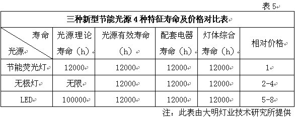 因素四.技術(shù)成熟與優(yōu)良的性價比使T5高效熒光燈成為所有新型節(jié)能光源運用之首 根據(jù)市場調(diào)研和有關(guān)資料表明,具備高光效、長壽命、高顯色性的新型光源主要是采用三基色熒光粉生產(chǎn)的節(jié)能熒光燈、LED和無極燈這三種產(chǎn)品。其中節(jié)能熒光燈中包含緊湊型熒光燈和T5雙端熒光燈。緊湊型用于替代白熾燈,而T5熒光燈則用于替代T8熒光燈。 表5是根據(jù)有關(guān)資料和實際使用狀況整理的三種新型節(jié)能光源的4種特征壽命及相對價格的對照表。