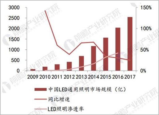 近年來,我國LED產(chǎn)業(yè)高速發(fā)展,滲率不斷提升。據(jù)前瞻產(chǎn)業(yè)研究院發(fā)布的《LED照明產(chǎn)業(yè)市場前瞻與投資戰(zhàn)略規(guī)劃分析報告》數(shù)據(jù)顯示,中國LED照明行業(yè)規(guī)模從78億元擴張超過2550億元,09-17年CAGR高達54.62%,LED通用照明市場的快速擴張,主因是通用照明行業(yè)的擴張與LED照明滲透率的提升,LED照明滲透率由2010年的0.6%升至2016年的42%。