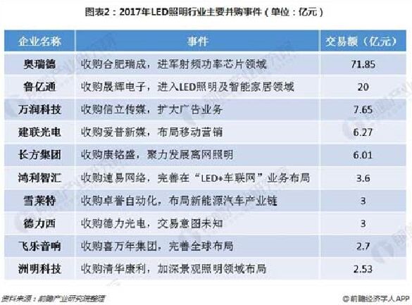 圖表2:2017年LED照明行業(yè)主要并購(gòu)事件(單位:億元)