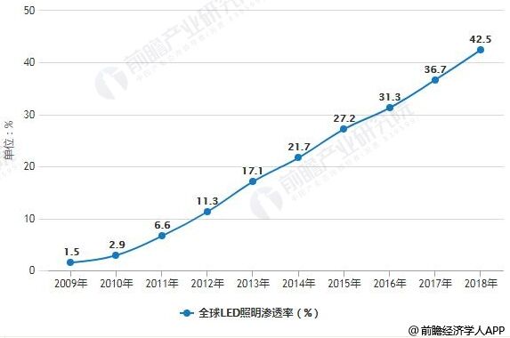 2009-2018年全球LED照明滲透率統(tǒng)計(jì)情況