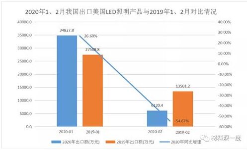 2020年前兩月我國共出口LED照明產(chǎn)品到(美國)共計(jì)4.09億美元,占整體出口額25.4%。今天給大家介紹一下2020年1-2月LED照明產(chǎn)品的出口(美國)情況。 一、對(duì)美國LED照明出口額略有下滑 據(jù)CSA Research對(duì)海關(guān)數(shù)據(jù)統(tǒng)計(jì)分析顯示, 2020年前兩月我國出口美國的LED照明產(chǎn)品共計(jì)4.09億美元,較2019年下跌了0.15%。雖然整體出口額和頭年變化不大,但每個(gè)月波動(dòng)明顯,1月份上漲26.60%,但二月份受新冠肺炎疫情影響,同比下跌了54.67%。
