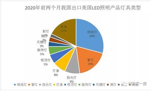 二、LED照明產(chǎn)品品類出口(美國)分布情況 從出口品類結(jié)構(gòu)來看,2020年前兩月球泡燈(未列名燈具除外)依然占據(jù)出口的LED照明產(chǎn)品最大比重,占整體出口額的29%,其次是管燈、透光燈、燈條等,占整體出口額分列19%、9%、8%,相較于19年,產(chǎn)品品類的占比出現(xiàn)重大變化變化,球泡燈出口占比上漲了12個(gè)百分點(diǎn),管燈出口占比超過了投光燈,同比上漲了6個(gè)百分點(diǎn),投光燈同比下滑了4個(gè)百分點(diǎn)。