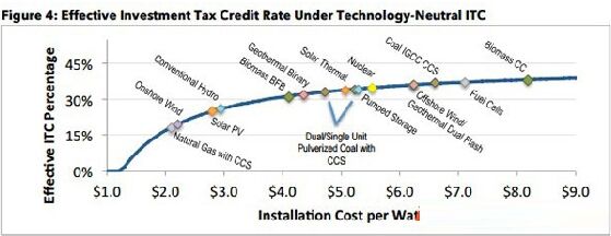 近日,美國一份最新出臺的與光熱發(fā)電行業(yè)發(fā)展密切相關的投資稅收抵免政策(ITC)提案建議:從2016年底要再次提高光熱發(fā)電項目的投資稅收抵免政策的補貼額度。 而根據此前奧巴馬政府的2015財政預算,ITC政策在2016年到期后將被廢除,以生產稅收抵免(PTC)政策予以代替,屆時光熱發(fā)電項目獲得總投資補貼的額度將從30%降至10%。 上述新的ITC提案是由AmitRonen提出的,曾作為參議員MariaCantwell副辦公室主任的他于2008年制定了為期8年的ITC政策。目前,任職華盛頓大學太陽能研究所主任的AmitRonen正在建議國會重新考慮可再生能源政策,但是他擔憂太陽能行業(yè)所追求的ITC政策的短期延期不太可能獲得立法許可。 Ronen和JamesMueller共同編撰的《太陽能軟著陸:做出正確選擇以避免ITC政策懸崖》一文提議,國會不應該再像此前那樣制定一刀切的ITC政策,而是要站在技術路線中立的角度來制定ITC政策,該政策應基于技術規(guī);统墒旎箜椖砍跏及惭b成本下降的幅度和趨勢來制定,因此不同的技術路線將會享受不同的ITC補貼額度。按照該提案建議的思路,光熱發(fā)電項目的ITC補貼額度應高于光伏項目,因為目前只有很少一部分光熱發(fā)電項目獲得了開發(fā),還根本沒有實現(xiàn)規(guī)劃化效益。 如下圖所示,在當前的成本條件下,光熱發(fā)電技術的ITC補貼額度應超過30%,而光伏發(fā)電技術則應低于30%。