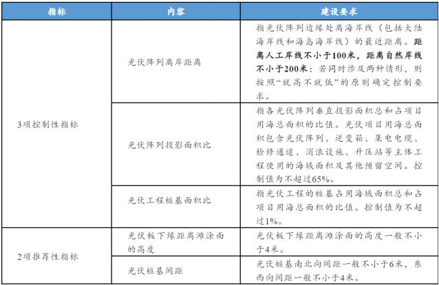 相關(guān)規(guī)范和標(biāo)準(zhǔn)規(guī)定,陸上光伏10MW光伏方陣用地指標(biāo)上限100公頃,海上風(fēng)電單個(gè)風(fēng)場(chǎng)外緣邊線包絡(luò)海域面積每10MW控制在16平方公里左右。為貫徹集約節(jié)約利用海域和海岸資源原則,有地方先于國家形成了海上光伏項(xiàng)目用?刂浦笜(biāo)。根據(jù)浙自然資規(guī)〔2022〕18號(hào)文件,針對(duì)開放海域的樁基式光伏項(xiàng)目提出了3項(xiàng)控制性指標(biāo)(光伏陣列離岸距離、光伏陣列投影面積比、光伏工程樁基面積比)和2項(xiàng)推薦性指標(biāo)(光伏板下緣距離灘涂面的高度、光伏樁基間距)。