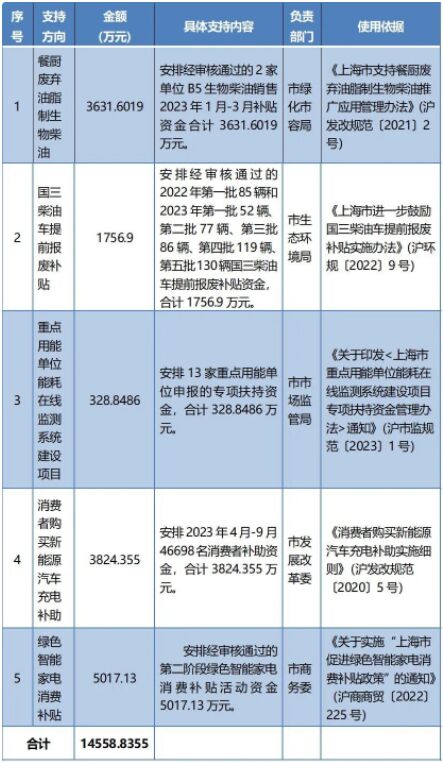 上海市2023年節(jié)能減排專項(xiàng)資金安排計(jì)劃(第二批)發(fā)布啦!支持方向?yàn)?span style="font-weight: bold;">餐廚廢棄油脂制生物柴油、國(guó)三柴油車提前報(bào)廢補(bǔ)貼、重點(diǎn)用能單位能耗在線監(jiān)測(cè)系統(tǒng)建設(shè)項(xiàng)目、消費(fèi)者購(gòu)買新能源汽車充電補(bǔ)助、綠色智能家電消費(fèi)補(bǔ)貼等5項(xiàng)工作,計(jì)劃下達(dá)節(jié)能減排專項(xiàng)資金14558.8355萬元,詳見↓