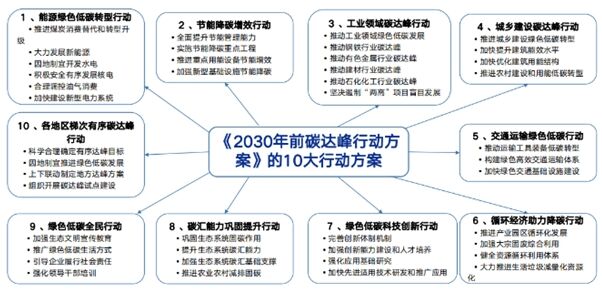 《2030年前碳達峰行動方案》中明確了碳達峰十大行動方案:(一)能源綠色低碳轉型行動;(二)節(jié)能降碳增效行動;(三)工業(yè)領域碳達峰行動;(四)城鄉(xiāng)建設碳達峰行動;(五)交通運輸綠色低碳行動;(六)循環(huán)經濟助力降碳行動;(七)綠色低碳科技創(chuàng)新行動;(八)碳匯能力鞏固提升行動;(九)綠色低碳全民行動;(十)省(市、區(qū))碳達峰碳中和實施方案。