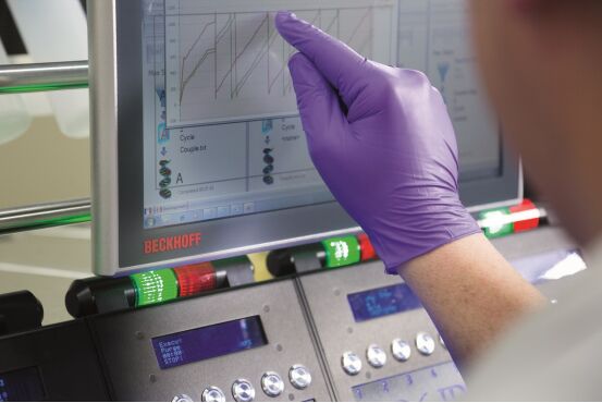 IDT 公司資深科學(xué)家 Dan Brock 正在檢查 M1 DNA 合成器的狀態(tài) 緊湊型解決方案占用空間小 CX2020 與一系列的 EtherCAT I/O 端子模塊連接。例如,16 通道高密度數(shù)字量輸出端子模塊 EL2809,將控制器的二進(jìn)制控制信號(hào)連接到過(guò)程層的執(zhí)行器。在另一端,一組電氣隔離 EtherCAT 數(shù)字輸入端子模塊 EL1819 負(fù)責(zé)接收和發(fā)送信號(hào)。模擬量端子模塊 EL3068 和 EL4008 具有連接各自現(xiàn)場(chǎng)總線設(shè)備的接口。用于登錄和授權(quán)的條形碼掃描儀通過(guò)串行接口端子模塊 EL6002 連接!癊therCAT I/O 系統(tǒng)是一款占用空間非常小的緊湊型解決方案!盧yan Witt 說(shuō)道!拔覀儸F(xiàn)在可以在以前只能容納兩臺(tái)設(shè)備的空間內(nèi)安裝四臺(tái)合成器!監(jiān)wen Piette 提到另一個(gè)優(yōu)點(diǎn):“有了中央控制器,我們能夠減少令人印象深刻的 66 % 的合成容器組裝時(shí)間! 一臺(tái)具有 15.6 英寸顯示屏的 CP3916 多點(diǎn)觸控面板用作緊湊型合成器的 HMI。由于顯示屏的玻璃面板具有出色的耐化學(xué)品性,非常適用于我們的合成過(guò)程。用戶甚至能夠戴著手套進(jìn)行操作!盌an Brock 解釋道。