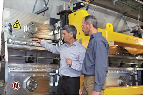 歐洲 XFEL 助理研究員 Suren Karabekyan 博士(左) 向來自倍福呂貝克分公司的 Nils Burandt 解釋波蕩器更細微的物理結(jié)構(gòu)細節(jié) 通過其像激光一樣的 X 射線線束,歐洲 X 射線自由電子激光裝置開辟了全新的研究領(lǐng)域,從而能夠?qū)崿F(xiàn)諸如納米三維圖像等功能,破譯病毒和細胞的原子結(jié)構(gòu)細節(jié),并檢查超快速的化學(xué)反應(yīng)。該設(shè)施總長為 3.4 公里,大部分位于地下隧道,并將由漢堡的歐洲 XFEL 研究機構(gòu)獨立運營。它將供來自世界各地的研究小組進行實驗研究。目前,已有十一個國家建設(shè)該裝置:丹麥、德國、法國、意大利、波蘭、俄羅斯、瑞典、瑞士、斯洛伐克、西班牙和匈牙利。 歐洲 X 射線自由電子激光裝置的特點是,在超導(dǎo)加速器技術(shù)的推動下每秒種 27,000 束 X 射線線束的超高重復(fù)率。線束的波長為 0.05 至 6 納米,其長度非常短,甚至可以看見原子結(jié)構(gòu)的細節(jié)。由于持續(xù)時間不到 100 飛秒(1 飛秒 = 10-15 秒),它甚至可以記錄分子或磁化反轉(zhuǎn)是如何形成的。激光的特性將使得在原子層三維成像成為可能。 被加速電子的 X 射線線束 X 射線線束形成的起始點是一個 1.7 公里長的超導(dǎo)線性電子加速器。電子束被加速到一個接近光速的高能量狀態(tài)。加速度在被稱為“諧振器”的特殊形狀的空腔中發(fā)生。這一切可以實現(xiàn)超導(dǎo),并衍射出 X 射線激光裝置所需的一束非常窄且均勻的電子束。 被加速的電子全速通過波蕩器 — 特殊的磁鐵組件,它強制粒子通過一個嚴(yán)密的回旋過程。電子發(fā)射出 X 射線,射線因為光與電子的交互而進一步放大。由于光的傳播速度比電子快,光“追趕并超過”粒子,并會在這一過程中對它們產(chǎn)生影響。其中一些電子被加速,另外一些則被減速,因此,這些電子構(gòu)成了大量薄盤。盤內(nèi)的所有電子現(xiàn)在同步輻射,產(chǎn)生超短、強烈的 X 射線線束,這些線束具有類似于激光的特性。 為了讓這個自放大自發(fā)輻射(SASE)的原理生效,波蕩器系統(tǒng)由多臺設(shè)備構(gòu)成,每臺設(shè)備都位于一個扇形陣列式加速器的后面。歐洲 X 射線自由電子激光裝置一開始將有 3 個波蕩器系統(tǒng) — SASE,1 和 2 各有 35 個 波蕩器單元,而 SASE 3 有 21 個單元。所有波蕩器系統(tǒng)加一起的總長度為 555.1 米。