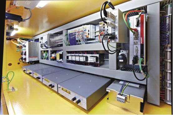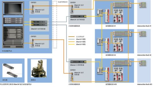 每個波蕩器單元共有 4 個 AM3052 伺服電機 —— 通過 TwinCAT NC PTP 控制 — 確保磁鐵結(jié)構(gòu)精確定位。(圖片顯示的是上面磁鐵結(jié)構(gòu)的兩個電機) 大量波蕩器單元需要復(fù)雜的自動化系統(tǒng) SASE 波蕩器段使用 19 寸抽拉式工業(yè) PC C5210 控制。它們通過具有電纜冗余的 EtherCAT 環(huán)形拓撲結(jié)構(gòu)聯(lián)網(wǎng)。由于隧道長達數(shù)公里,因此必須使用光纖電纜。此外,每個 SASE 段中的波蕩器單元通過菊花鏈形式的以太網(wǎng)互相鏈接。在每個波蕩器單元中,控制柜式 PC C6925 通過 TwinCAT NC PTP 控制用于4 個 AM3052 伺服電機的 2 個 AX5206 伺服驅(qū)動器。工業(yè) PC 還控制三個步進電機 — 兩個用于四極動子,一個用于移相器。移相器電機與伺服驅(qū)動器同步運行,并校正各個波蕩器單元之間電子和光子束的相位。針對所需的 I/O 數(shù)據(jù),每個波蕩器單元提供 35 個 EtherCAT 端子模塊,模擬量和數(shù)字量 I/O、以及脈沖、編碼器和橋接端子模塊?傮w來說,基于 PC 的控制解決方案由三臺 19 英寸抽拉式工業(yè) PC C5210、91 臺控制柜式 PC C6925、182 個 AX5206 伺服驅(qū)動器、364 個 AM3052 伺服電機以及約 3200 個 EtherCAT 端子模塊構(gòu)成。