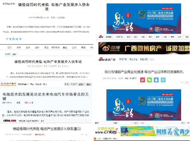 2017第二屆亞太電池展將于8月16-18日在廣州·中國進(jìn)出口商品交易會展館A區(qū)隆重舉行,近日,人民網(wǎng)、廣東經(jīng)濟(jì)網(wǎng)、廣東之窗、中國經(jīng)濟(jì)網(wǎng)、中國日報(bào)網(wǎng)、深圳經(jīng)濟(jì)網(wǎng)、京華網(wǎng)(京華時報(bào))、中華網(wǎng)經(jīng)濟(jì)頻道、中國新聞網(wǎng)、中國網(wǎng)科學(xué)頻道、中國日報(bào)網(wǎng)、中國貿(mào)易新聞網(wǎng)、中國科技網(wǎng)、中國財(cái)經(jīng)時報(bào)網(wǎng)、亞洲網(wǎng)新聞、新浪廣西、新華網(wǎng)巴中頻道、騰訊汽車、搜狐媒體、汽車點(diǎn)評網(wǎng)、齊魯在線、京華網(wǎng)(京華時報(bào))、環(huán)球汽車網(wǎng)、華訊財(cái)經(jīng)網(wǎng)、廣佛都市網(wǎng)、莞訊網(wǎng)、東莞信息港財(cái)經(jīng)、第一財(cái)經(jīng)網(wǎng)、大洋網(wǎng)新聞、財(cái)經(jīng)中國、新快網(wǎng)、網(wǎng)易、金羊網(wǎng)科技頻道、和訊河南頻道、廣州視窗、鳳凰網(wǎng)邵陽汽車、東方財(cái)富網(wǎng)、大公網(wǎng)財(cái)經(jīng)頻道、21CN科技頻道、財(cái)經(jīng)界等近50家知名媒體對其進(jìn)行了報(bào)道。
