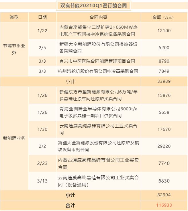 4月19日,雙良節(jié)能發(fā)布了2021年一季度報告,公告顯示,一季度實現(xiàn)營業(yè)收入4.34億元,同比增長97.37%;凈利潤2742萬元,同比增長198.98%。利潤增長主要系公司強化精細化管理,增強市場意識,抓住了市場機遇,有效地提升了企業(yè)經(jīng)營業(yè)績。 一季度業(yè)績創(chuàng)近五年新高 雙良節(jié)能一季報顯示,實現(xiàn)營業(yè)收入4.34億元,同比增長97.37%;凈利潤2742萬元,同比增長198.98%。與此同時,2021年一季度與2019年一季度相比,營收增長24%,凈利潤增長達161%。 隨著疫情的緩解,雙良節(jié)能業(yè)務改善非常明顯,這也一定程度上表明了公司不僅經(jīng)營快速恢復,而且其戰(zhàn)略規(guī)劃、產(chǎn)品、模式上的轉(zhuǎn)型也取得了突破性的進展。今年一季度營收和凈利潤均創(chuàng)近五年的新高,給市場交出了一份令人驚喜的成績單。 節(jié)能減排和新能源齊頭并進 近期,雙良節(jié)能頻頻公告大額訂單,從溴化鋰熱泵到空冷系統(tǒng),再到多晶硅還原爐,從余熱利用到循環(huán)水冷卻,再到光伏新能源,無一不是在助推“碳達峰、碳中和”目標的實現(xiàn),而“碳達峰、碳中和”政策也將進一步提升節(jié)能減排和光伏新能源的業(yè)務需求。 數(shù)據(jù)顯示,公司自2020年起公告的訂單合同累計近33億元。其中,今年一季度公告的訂單合同金額高達11.69億元,一季度節(jié)能節(jié)水業(yè)務占3.39億元;一季度新能源業(yè)務占8.30億元。 這意味著,雙良節(jié)能基本實現(xiàn)了雙輪驅(qū)動,節(jié)能減排和新能源兩大板塊業(yè)務齊頭共進。隨著交付緊密期的臨近、經(jīng)營旺季的來臨,未來公司的業(yè)績將明顯得到提升。