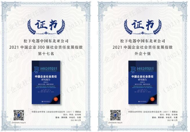 2021年12月3日,由中國社科院舉辦的“第十三屆《企業(yè)社會責任藍皮書》發(fā)布會”在京舉辦。在本次活動中,發(fā)布了最新的中國企業(yè)300強(國企、民企、外企)社會責任發(fā)展指數(shù)排名,松下電器取得了總排名第17位,外企第3名的優(yōu)異評價。