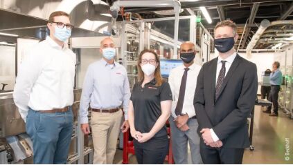 (左起)倍福團隊成員應用開發(fā)工程師 John Helfrich、區(qū)域銷售工程師 Charles Usher 和應用工程師 Lauren de Rosset 與 Glidewell 公司的自動化部經(jīng)理 Kunal Patil 以及工程副總 David Leeson 密切合作