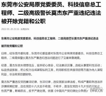 據(jù)東莞新聞報(bào)道,2021年10月莫杰東被立案審查后,對(duì)犯罪事實(shí)供認(rèn)不諱,初步確認(rèn)貪污受賄高達(dá)6000多萬,還牽扯出一大批貪官。原來此人利用手中的公權(quán)力(可以監(jiān)聽、錄影、調(diào)用、刪除東莞市的監(jiān)控系統(tǒng)),以此販賣或威脅當(dāng)事人的監(jiān)控視頻,并從而謀取巨大私利。