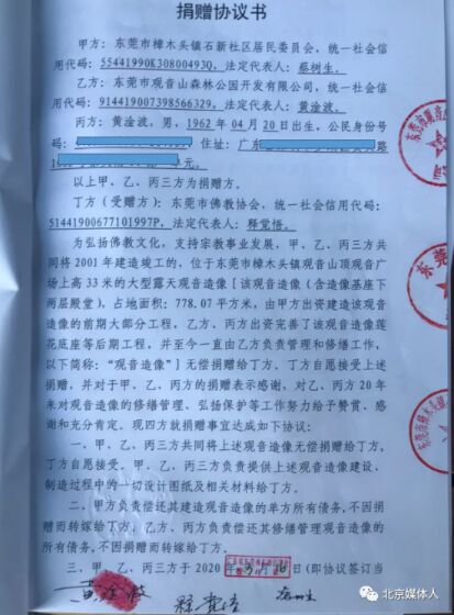 觀音像在2001年開完光以后,黃淦波就寫了一個(gè)捐贈(zèng)書給東莞市民宗局,大概內(nèi)容是說觀音像建好了,開完光了,觀音寺也得到批復(fù)可以重建。觀音山公園主動(dòng)把這些財(cái)產(chǎn)捐給東莞市佛j協(xié)會(huì),特此為證,簽了名蓋了章送到東莞市民宗局——可惜此文件據(jù)說已找不到。2007年,胡某棋又勒令黃淦波簽署一份類似的捐贈(zèng)協(xié)議,此協(xié)議有文本仍在,可查,但胡某棋說不承認(rèn)有此事。