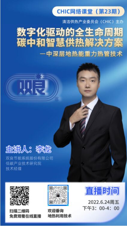 2022年6月24日(周五下午)三點,由清潔供熱產(chǎn)業(yè)委員會(CHIC)主辦的“CHIC網(wǎng)絡(luò)課堂”將邀請到雙良節(jié)能系統(tǒng)股份有限公司低碳產(chǎn)業(yè)技術(shù)研究院技術(shù)經(jīng)理李龍為大家分享《數(shù)字化驅(qū)動的全生命周期碳中和智慧供熱解決方案—中深層地?zé)崮苤亓峁芗夹g(shù)》主題講座。
