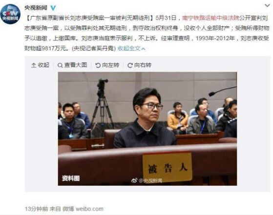 2017年5月31日,南寧鐵路運輸中級法院公開宣判廣東省人民政府原副省長劉志庚受賄一案,對被告人劉志庚以受賄罪判處無期徒刑,剝奪政治權(quán)利終身,并處沒收個人全部財產(chǎn);受賄所得財物予以追繳,上繳國庫。劉志庚當庭表示服判,不上訴。
