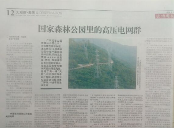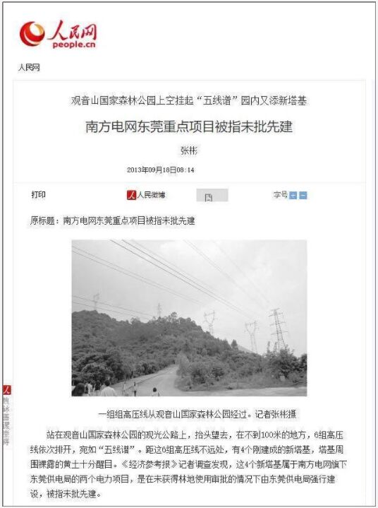 追溯起來,可以說早在2002年,廣東電網(wǎng)公司東莞市供電局就在未經(jīng)公園同意,也未向公園方提供國家林業(yè)、國土資源等部門關(guān)于同意在公園內(nèi)架設(shè)高壓線塔的批復文件夾,就擅自違法將多組高壓線塔強行架設(shè)在觀音山國家級森林公園內(nèi)。