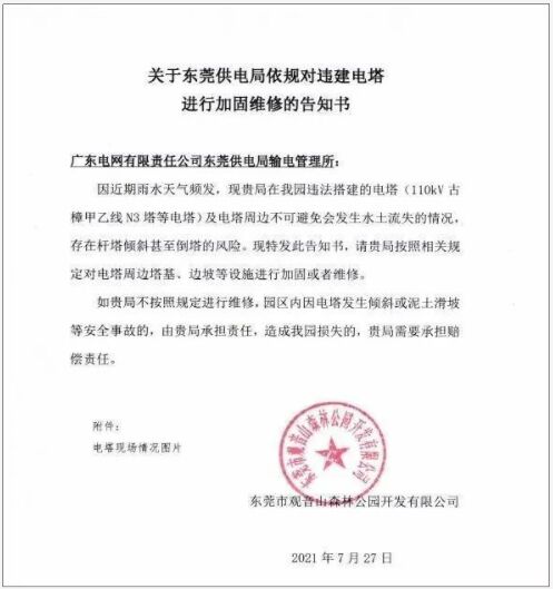 2021年7月27日,因雨水天氣頻發(fā),加之觀音山內(nèi)的高壓線的基座建設(shè)在坡地,受雨季水土流失影響的可能性很大,存在桿塔傾斜甚至倒塔的風險。這種現(xiàn)象實際發(fā)生后,觀音山積極要求、發(fā)函敦促東莞供電局盡快依法依規(guī)進場按照相關(guān)規(guī)定對傾斜電塔周邊塔基、邊坡等設(shè)施進行加固或者維修。