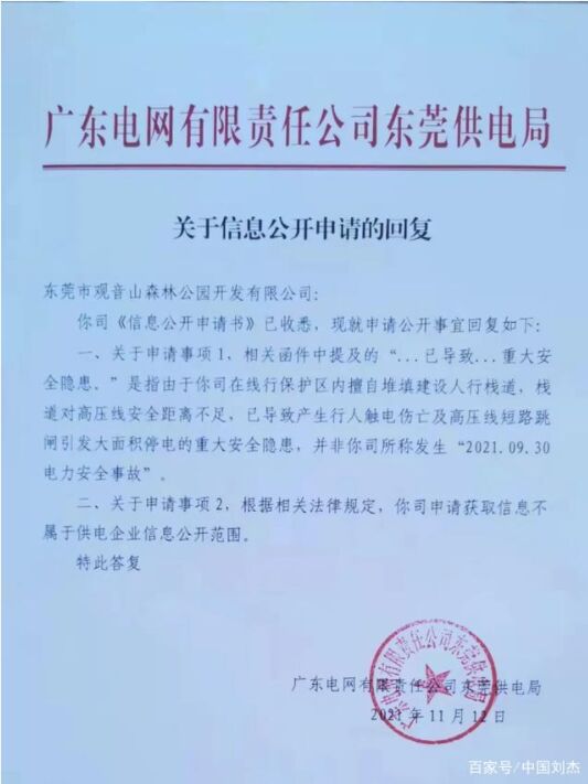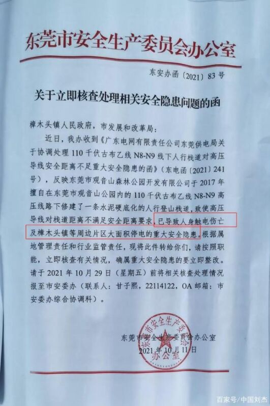 本應是一起簡單的對山體塔方形成的傾斜電塔的塔基進行維護加固的公事,應該是供電部門的工作義務。結(jié)果,供電部門不僅直接拒收觀音山方的信函,反而于10月11日向樟木頭人民政府發(fā)函稱:觀音山公園不自行維護,在我局主動要求維護的情況下,還阻擾我局對影響桿塔安全的邊坡進行維修。并稱“觀音山森林公園在線行保護區(qū)內(nèi)擅自堆填建設(shè)人行棧道,并將其開放供人員活動的行為,已導致人身觸電傷亡及樟木頭鎮(zhèn)等周邊片區(qū)大面積停電的重大安全隱患。”