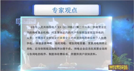 在專題節(jié)目中,北京林業(yè)大學教授楊朝霞發(fā)表觀點:我們說二十幾年來,他80%的電是他自己發(fā)電的,就是東莞市供電公司不給。這個來說是違法的。因為我們的《電力法》是明確規(guī)定的,就是電力公司、電力的供電機構(gòu)是有給用戶供電的強制的義務的。你不能拒絕供電,如果是拒絕供電,那麼就是違法,正常供電就是你的強制義務。