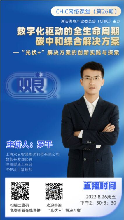 2022年8月26日(周五下午)兩點(diǎn)半,由清潔供熱產(chǎn)業(yè)委員會(huì)(CHIC)主辦的“CHIC網(wǎng)絡(luò)課堂”將邀請(qǐng)到上海雙良智慧能源科技有限公司數(shù)智開(kāi)發(fā)部經(jīng)理羅平為大家分享《數(shù)字化驅(qū)動(dòng)的全生命周期碳中和綜合解決方案—“光伏+”解決方案的創(chuàng)新實(shí)踐與探索》主題講座。