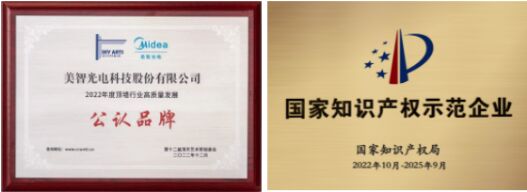 截止2022年12月,美智光電累計取得境內專利 644余項,其中發(fā)明專利80余項,專利涵蓋智慧調光、多用戶場景照明控制、智能家居交互、智能開關控制、ZigBee 網(wǎng)絡控制、語音控制等多個智慧場景。不僅如此,2022年美智光電憑借科技研發(fā)實力獲評“國家知識產(chǎn)權示范企業(yè)”;在智能吊頂領域,以實力榮獲“2022年頂墻行業(yè)高質量發(fā)展公認品牌”稱號。