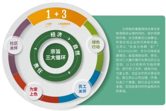 立邦在保持主營業(yè)務(wù)取得良好成績的同時,保護(hù)資源和環(huán)境,關(guān)注慈善及公益事業(yè),積極實現(xiàn)企業(yè)的可持續(xù)發(fā)展。 “永續(xù)大地精‘彩’”可持續(xù)發(fā)展理念,立邦以“經(jīng)濟(jì)循環(huán)、自然循環(huán)、責(zé)任循環(huán)”對應(yīng)“公司治理、環(huán)境、社會”,以三大循環(huán)推動企業(yè)的可持續(xù)發(fā)展,刷新特色CSR體系,向ESG治理進(jìn)階。以立邦公司為“1”,以利益相關(guān)方為“3”,建立1+3機(jī)制,讓“經(jīng)濟(jì)循環(huán)、自然循環(huán)、責(zé)任循環(huán)”不止于企業(yè)內(nèi)部,而是衍生至全社會。同時,立邦開展綠色行動、踐行員工關(guān)懷、注重社區(qū)關(guān)懷、推動「為愛上色」公益平臺,用全情投入和切實行動,以實現(xiàn)三大循環(huán),讓“永續(xù)大地精‘彩’”有自然之美、人文之美、發(fā)展之美。