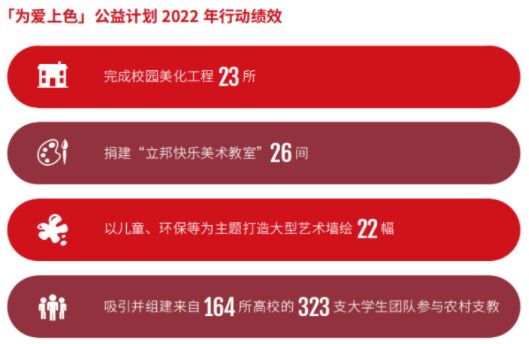 立邦「為愛上色」項目自2009年發(fā)起運(yùn)營至今,持續(xù)通過校園環(huán)境美化、美術(shù)教室捐贈、藝術(shù)家墻繪創(chuàng)作、農(nóng)村支教等行動為世界帶去愛、色彩與歡樂。去年,立邦「為愛上色」成績突出:為23所校園進(jìn)行彩色涂刷,累計共為406所鄉(xiāng)村學(xué)校刷新校園空間。捐贈26間學(xué)校美術(shù)教室,累計共捐建390間“立邦快樂美術(shù)教室”以支持鄉(xiāng)村美術(shù)教育發(fā)展。創(chuàng)作22幅大型墻繪,累計共創(chuàng)作214幅墻繪創(chuàng)作,助力將藝術(shù)和色彩融入當(dāng)?shù)匚幕。攜手“知行計劃”繼續(xù)開展中國大學(xué)生農(nóng)村支教獎,來自164所高校大學(xué)生團(tuán)隊報名參與,開展支教活動2,112+天,惠及4,0000+名鄉(xiāng)村師生。