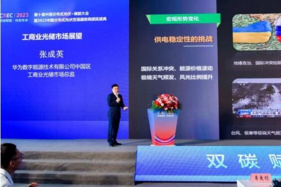 在第十屆中國分布式光伏+儲能論壇上,華為數(shù)字能源中國區(qū)智能光伏工商業(yè)光儲市場總監(jiān)張成英分享了《工商業(yè)光儲市場展望-光儲融合全面智能》,介紹了宏觀形勢、政策、市場熱點的變化,并對工商業(yè)光伏、儲能、光儲融合、BIPV等幾個場景的技術(shù)發(fā)展趨勢進(jìn)行了洞察。