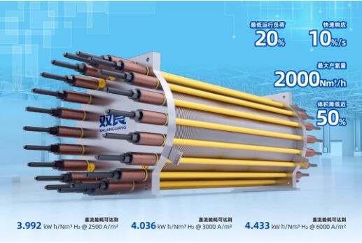 本屆展會(huì)上,雙良向外界展示了具有國(guó)際先進(jìn)水平的JSDJ S1系列堿性水電解槽新品。擁有自主知識(shí)產(chǎn)權(quán)的S1系列產(chǎn)品采用高電密設(shè)計(jì),集安全性、先進(jìn)性、穩(wěn)定性、智能化、永不漏堿的高性能等五大核心優(yōu)勢(shì)于一體,通過(guò)流場(chǎng)結(jié)構(gòu)的優(yōu)化設(shè)計(jì),制造裝配的嚴(yán)格管控,可實(shí)現(xiàn)最大產(chǎn)氫量2000Nm³/h。同時(shí),依托雙良先進(jìn)的全智慧化系統(tǒng)Wonder Cloud/OS數(shù)字化平臺(tái)+AI算法+AIoT終端一體化系統(tǒng)技術(shù),保證系統(tǒng)在最優(yōu)工況下穩(wěn)定運(yùn)行,提升氫能產(chǎn)量,減少啟動(dòng)速度,減少人員干預(yù)和操作,讓氫能變得更智慧。