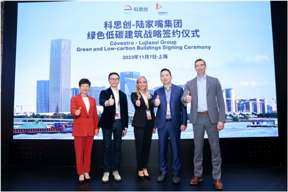 ( 科思創(chuàng)攜手陸家嘴集團(tuán),推進(jìn)綠色低碳建筑發(fā)展。左起:科思創(chuàng)中國(guó)區(qū)總裁雷煥麗,陸家嘴集團(tuán)總經(jīng)理蔡嶸,科思創(chuàng)定制化聚氨酯事業(yè)部全球負(fù)責(zé)人Christine Bryant,陸家嘴集團(tuán)董事長(zhǎng)徐而進(jìn),科思創(chuàng)首席執(zhí)行官施樂(lè)文博士 © 科思創(chuàng) )