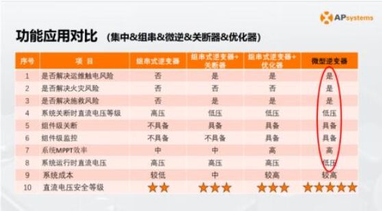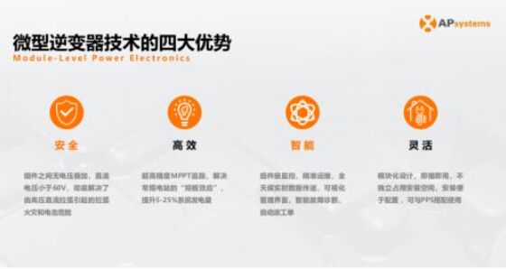 伴隨分布式光伏的加速滲透,安全、智能、靈活逐漸成為光伏逆變器重要的衡量標(biāo)準(zhǔn),以微型逆變器為代表的MLPE的技術(shù)優(yōu)勢也日益凸顯。對此,周總綜合對比組串式逆變器、微型逆變器、關(guān)斷器和優(yōu)化器的技術(shù)特點,指出:微型逆變器技術(shù)路線具有安全、高效、智能、靈活四大優(yōu)勢。