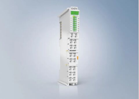 EtherCAT 端子模塊 EL4374 將可參數(shù)化的模擬量輸入和輸出結(jié)合在一個(gè)緊湊的、帶 LED 信號(hào)指示燈的高密度外殼中
