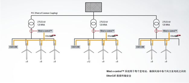 為了確保風場擴建后能夠為蘇格蘭格拉斯哥市可靠地供電,運營商使用了EtherCAT高速通訊系統(tǒng)及相應(yīng)的控制組件。 圖片顯示了一組PCC(公共連接點) 近日,歐洲風能協(xié)會發(fā)布了一些預(yù)測數(shù)據(jù):歐洲風電將取得進一步的動態(tài)發(fā)展,到 2020 年,風電總裝機容量將實現(xiàn) 64%的增長。作為這一發(fā)展的組成部分,數(shù)十臺總輸出量為 217 兆瓦的風力發(fā)電機最近由法國阿爾斯通公司安裝在了蘇格蘭風場中。極速EtherCAT通訊網(wǎng)絡(luò)和Beckhoff相應(yīng)的 I/O 組件構(gòu)成這一歐洲最大陸上風電項目的通訊主干。 阿爾斯通這一最新的風電項目主要在蘇格蘭格拉斯哥附近擴建的Whitelee風場中運行。新增的 217 兆瓦的裝機容量,足夠滿足 124,000 戶家庭的用電需求。此次陸上風場的擴建為整個歐洲大陸設(shè)立了新標準,此外,這也是阿爾斯通功能強大的 ECO 100 風力發(fā)電機的第一個大型項目。阿爾斯通在該風場總共安裝了 69 臺3 兆瓦的 ECO 100 風力發(fā)電機,6 臺1.67 兆瓦的 ECO 74 風力發(fā)電機。 先進的控制技術(shù)確保可靠的風場運營 阿爾斯通的 Wind e-control™ 系統(tǒng)負責風場內(nèi)的控制任務(wù),如電壓、功率和頻率控制。例如,為了檢查風電場并網(wǎng)轉(zhuǎn)換點處的無功功率,Wind e-control™ 系統(tǒng)從風場采取了各種措施。每個相應(yīng)國家的電網(wǎng)準則都可以通過此控制系統(tǒng)可靠地實現(xiàn)。電網(wǎng)準則中描述的要求是為了保證電網(wǎng)的穩(wěn)定,在可再生能源產(chǎn)業(yè)不斷擴大時這是最重要的。除此之外,控制系統(tǒng)允許在控制室進行現(xiàn)場運營管理或通過與 SCADA 系統(tǒng)進行數(shù)據(jù)通訊遠程進行管理。Wind e-control™ 系統(tǒng)已首次在這個風場中安裝并成功應(yīng)用。