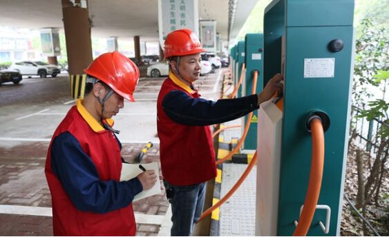 (國網(wǎng)邵陽供電公司共產(chǎn)黨員服務(wù)隊(duì)在步步高商場充電站進(jìn)行日常維護(hù)作業(yè)。圖片由 星辰全媒體記者 賀亞玲 攝)