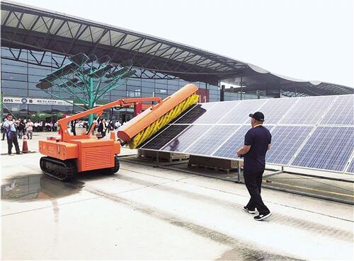 日前,在第十二屆(2018)國際太陽能產(chǎn)業(yè)及光伏工程展覽會上,某參展商正在使用一臺大型光伏清潔機(jī)做演示。
