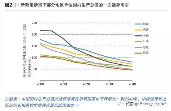 在新政策情景下,中國(guó)的能源需求增長(zhǎng)速度下降到每年1%左右,不到該國(guó)自2000年以來(lái)的年平均水平的六分之一。這是經(jīng)濟(jì)結(jié)構(gòu)轉(zhuǎn)變、強(qiáng)勁能源效率政策實(shí)施和人口變化所帶來(lái)的綜合效應(yīng)。到2040年,能源需求總量的增長(zhǎng)水平將與2008年至2016年這八年期間的增長(zhǎng)水平基本持平。由于經(jīng)濟(jì)繼續(xù)快速增長(zhǎng),平均增長(zhǎng)率為每年4.5%,相當(dāng)于能源強(qiáng)度每年改善3.4%,據(jù)我們預(yù)測(cè),這是截至2040年世界范圍內(nèi)最快的改善速度。到2040年,中國(guó)人均能源消費(fèi)量也將增長(zhǎng)四分之一,將在2035年左右超越歐盟。
